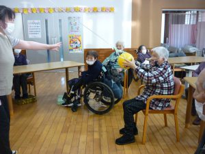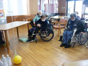 レクリエーション(ボーリング) 2022年1月24日 午後のレクの時間に 久しぶりにボーリングをしました 天井から吊り下げたボールをペットボトルのピンにあてて競います さあ、どなたが一番でしょう 日々の出来事